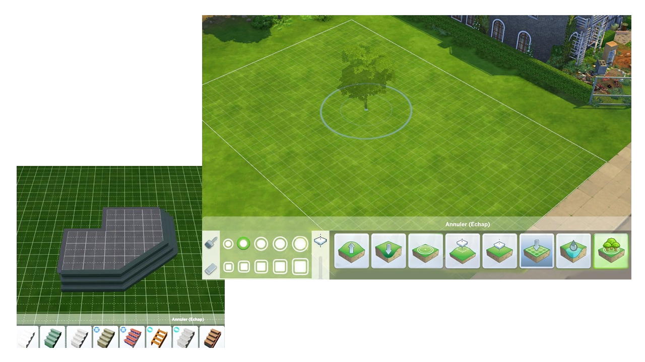 Iniciando os conceitos do modo construção em si, vemos uma ideia de ferramenta que possibilita colocar árvores à medida que você passa selecionando o chão com o mouse, e isso seria simplesmente a melhor ferramenta pra quem possui dificuldades ao  fazer um jardim mais denso. Esse conceito nos lembra muito a ferramenta inclusa na série de jogos SimCity, pois lá é mais do que necessário uma ferramenta que coloca árvores em grandes quantidades.