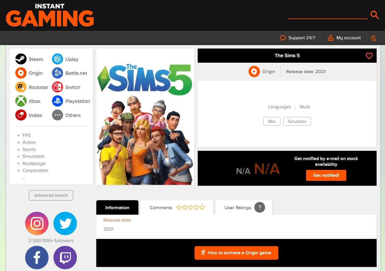 Recentemente veio a tona um site vendendo o “The Sims 5”. O produto possui apenas a imagem da capa (claramente uma ilustração temporária), e está filtrado como um game da Origin, para Mac. Nenhuma informação de preço está incluída no produto, no lugar, há apenas uma mensagem avisando a falta de estoque. A data de lançamento informada é 2021.