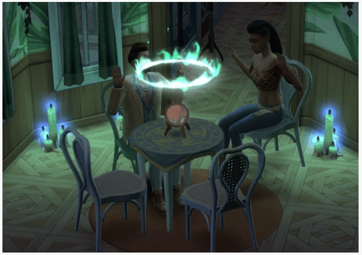 Ao usar uma Mesa de Sessões, você desenvolverá sua Habilidade de Médium, desbloqueando novas sessões, a capacidade de hospedar sessões em grupo e a capacidade de desenhar Círculos de Sessões de giz em qualquer lugar do mundo! E se você for um Sim de Spellcaster, você ganhará habilidade muito mais rápido devido à sua familiaridade com as artes místicas. Esta habilidade e a Mesa de Sessões estão disponíveis para crianças e adolescentes também!
