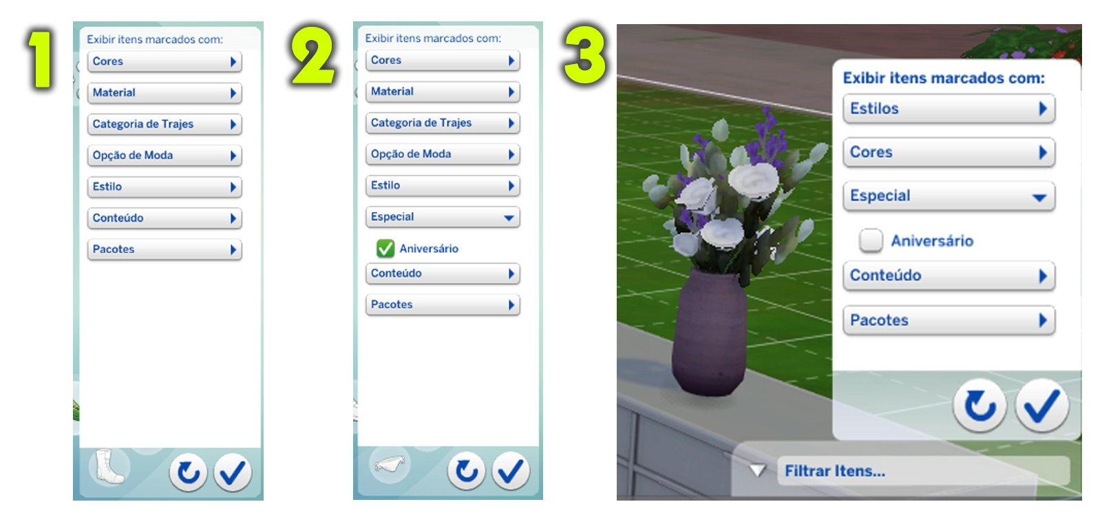 Hoje, a atualização comemorativa do The Sims 4 trouxe, além de novos itens de compra e criar um sim, um novo filtro para facilitar a busca desses novos itens.