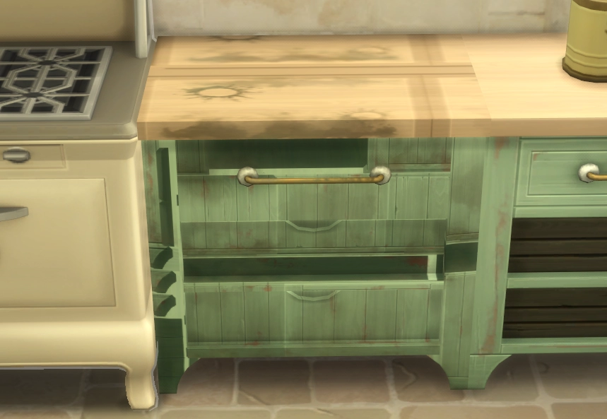 O primeiro problema encontrado é um erro simples de textura, de um dos objetos do Kit The Sims 4 Cozinha Campestre. Trata-se de uma bancada de cozinha, que quando está suja apresenta um glitch. Provavelmente isso não acontecerá a partir da próxima atualização. O erro foi encontrado e postado pelo usuário do Twitter, @LuddySimmer.