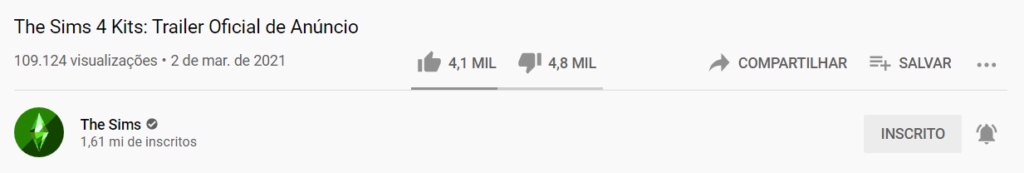 Mas no geral, conseguimos observar o nível de (in)satisfação que os Kits tiveram no The Sims 4 por um fator muito comum, explícito, e acessível à todos que queiram se expressar positivamente ou negativamente; são os (des)likes no trailer oficial de lançamento dos Kits. Passadas exatas 20 horas desde sua publicação no YouTube, já é expressiva a quantidade de avaliações negativas; veja: