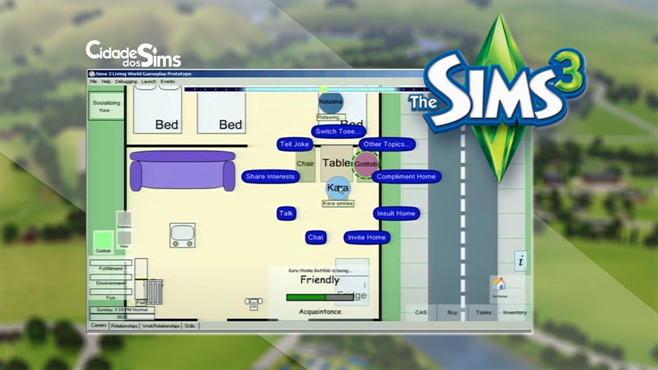 Note alguns detalhes nas imagens: o nome do programa em execução é “Sims 3 Living World Gameplay Prototype“. Na interface já era possível perceber o sistema de ações, sistema de carreiras, sistema de interações, sistema de relacionamentos, inventário, tarefas (provavelmente relacionadas ao desejo duradouro), e até um botão para ir direto ao CAS.