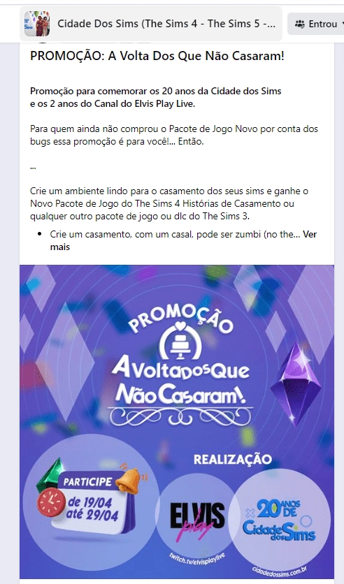 Está no ar nossa nova PROMOÇÃO! Para você que não comprou o novo pacote por conta dos bugs, e acabou deixando seus sims sem o casamento kkk; ou para você que só tem jogado o The Sims 3! Todos podem participar!