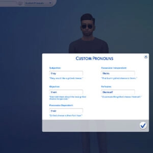 Nesta iteração do recurso, nós nos concentramos nos pronomes. Apesar dos pronomes serem uma parte importante quando se trata de inclusão no The Sims 4, sabemos que os pronomes personalizados não tornarão o jogo 100% neutro em relação ao gênero. Ainda será possível encontrar casos de linguagem com gênero no jogo, tais como mãe, pai, etc.