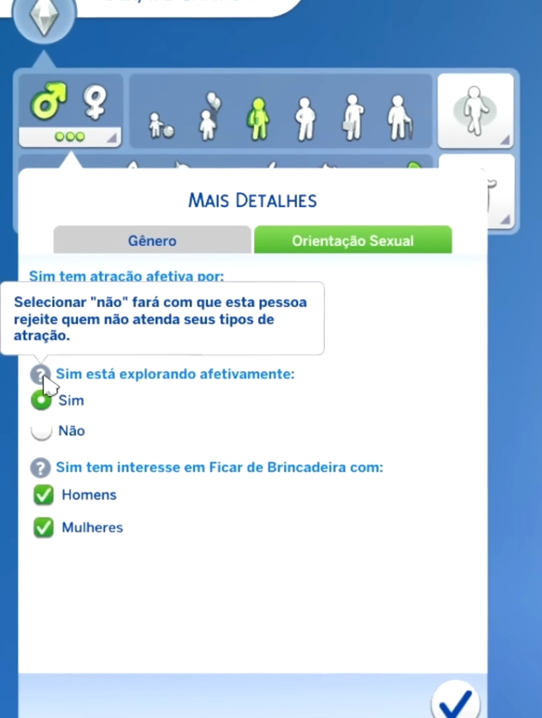 Agora podemos escolher a atração afetiva dos nossos sims, se será para Homens ou Mulheres, se nosso sim vai poder explorar também afetivamente ou não.