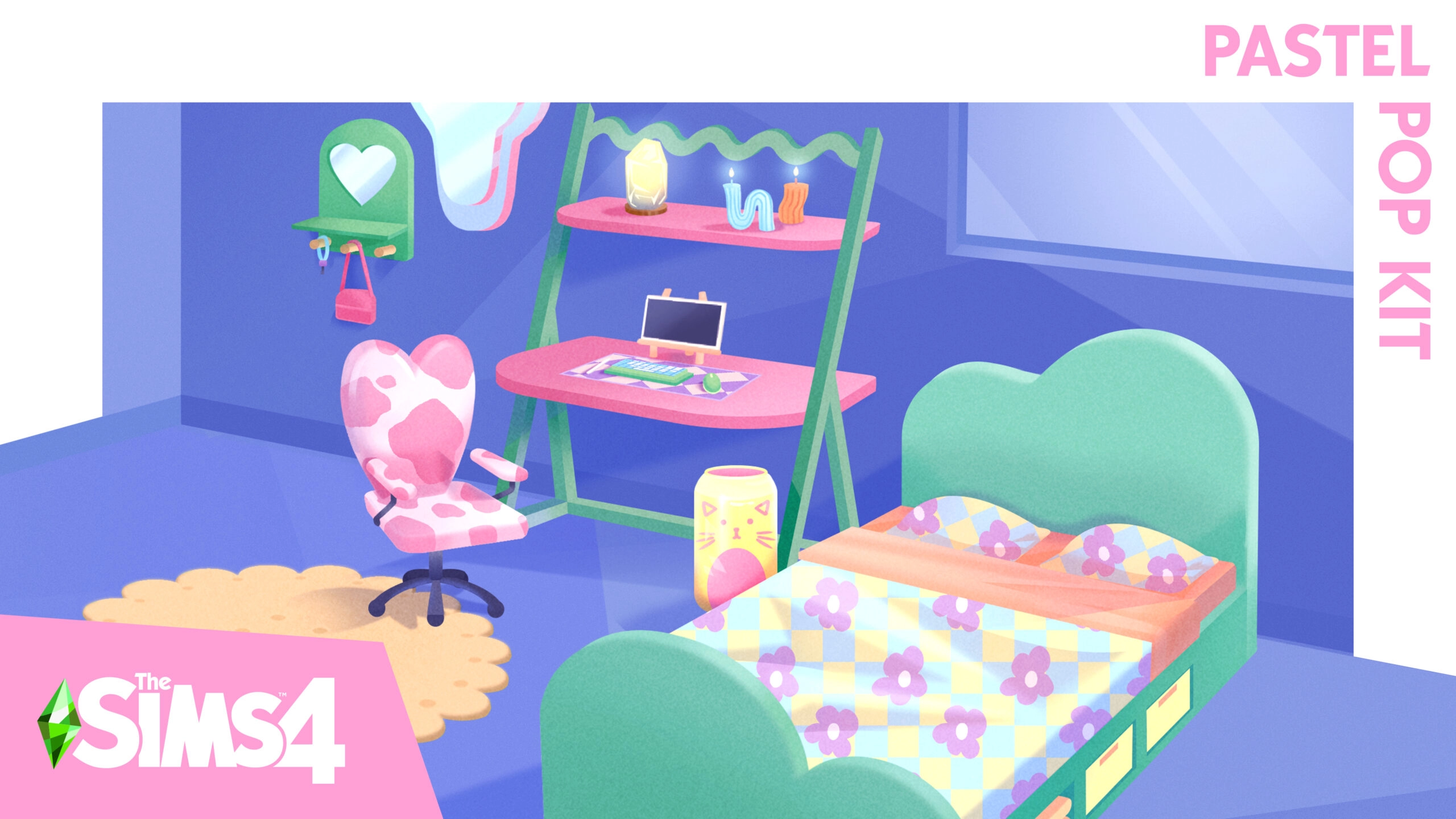 Produza um quarto agradável e divertido, perfeito para os Sims sonharem acordados com o The Sims™ 4 Kit Tons Pastel*! Misture estampas simples e psicodélicas com tons pastel inusitados, formas irregulares e estilo vintage. Esta coleção é incrível para o dormitório, quarto ou apartamento estúdio de seu Sim.