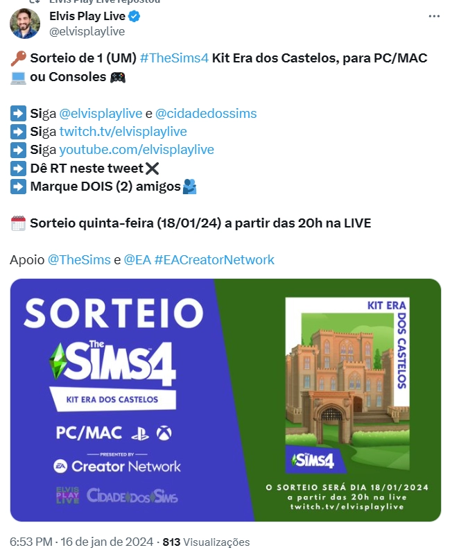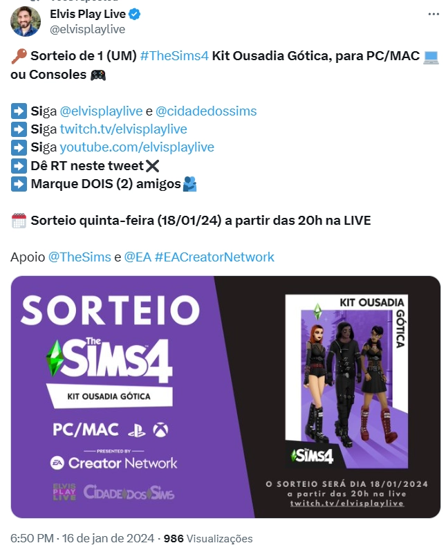 Não perca essa oportunidade de ganhar os novos kits do The Sims 4 e se participar da LIVE do Elvisplaylive. A live promete ser muito animada e cheia de surpresas. Esperamos você lá!