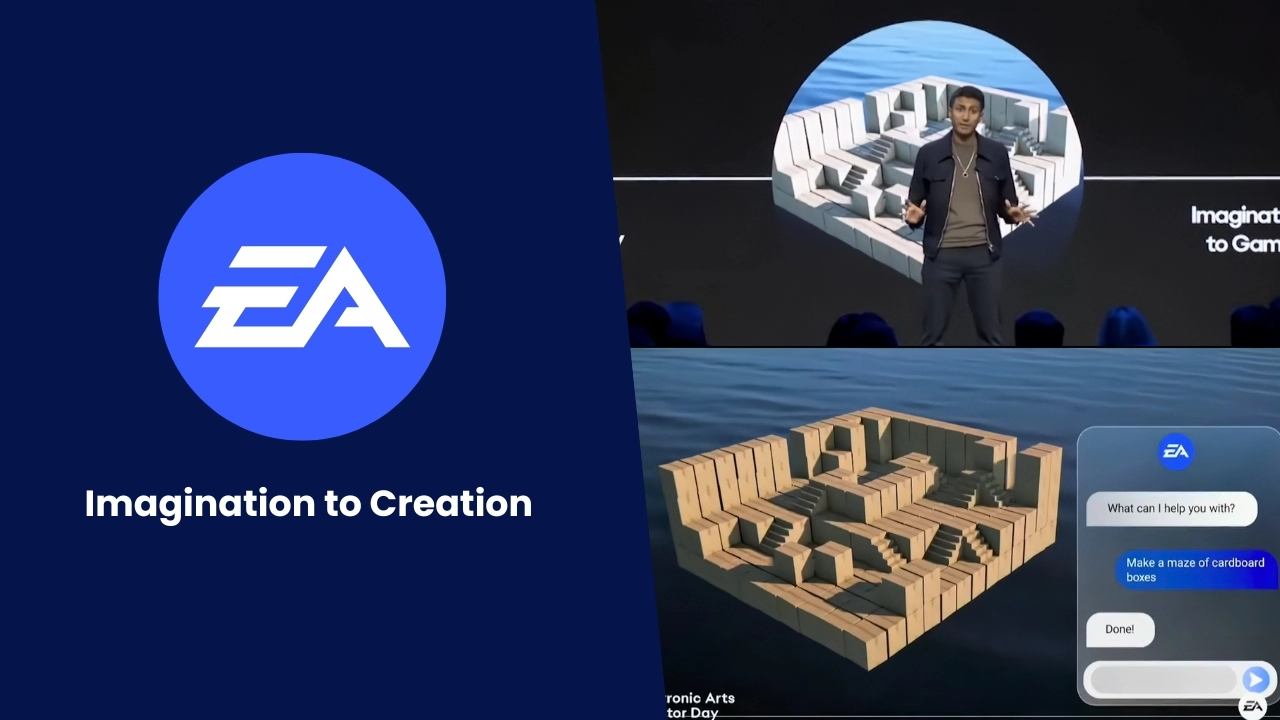 O conceito foi exemplificado com dois jogadores que, ao vivo, transformaram caixas de papelão em universos multiníveis, gerando personagens, armas e até regras de jogabilidade em tempo real. A tecnologia utiliza uma extensa biblioteca de ativos da EA, composta por centenas de milhares de modelos 3D, milhões de linhas de código e trilhões de eventos de telemetria — dados gerados automaticamente durante o uso dos jogos, que ajudam a monitorar e melhorar a experiência do jogador. Isso cria uma base sólida para a criação dinâmica e em tempo real.