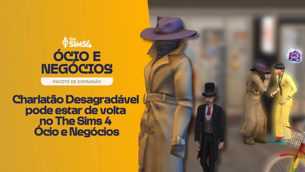 Uma das imagens promocionais de The Sims 4 Ócio e Negócios mostra um Sim misterioso usando sobretudo, chapéu e rosto coberto, levantando suspeitas de que o Charlatão Desagradável pode estar de volta. Esse NPC, famoso por aplicar golpes e roubar simoleons no The Sims 2: Bon Voyage, parece se encaixar no contexto da nova expansão, que foca em negócios e movimentação de dinheiro.