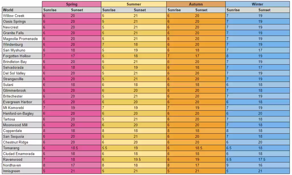Além disso, os horários de nascer e pôr do sol mudam conforme a estação nos mundos mais antigos, mas permanecem fixos o ano todo em Innisgreen, Copperdale e Chestnut Ridge, todos desenvolvidos pela mesma equipe, mostrando uma diferença clara no padrão de detalhamento aplicado aos conteúdos mais recentes.