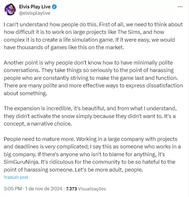 Sempre recomendei que todos da comunidade que estejam enfrentando problemas com o jogo reportem utilizando o fórum oficial da EA, buscando sempre manter um diálogo civilizado. Discordar das decisões criativas não justifica ataques pessoais ou comportamentos hostis.