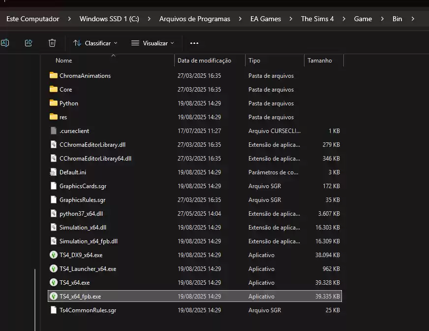 Foi achado um executável novo chamado TS4_x64_fpb.exe na pasta do jogo (The Sims 4 > Game > Bin) e um arquivo Simulation_x64_fpb.dll que roda junto com ele.