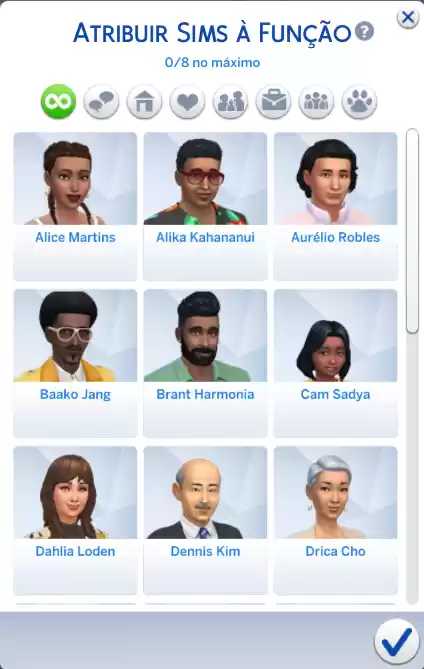 Para decidir que tipo de Sim você quer em uma Função, é possível usar os Critérios dos Sims para escolher este perfil, além de escolher Sims específicos que deseja ver incluídos na função em questão. Ao usar Critérios dos Sims, você escolherá quais Traços, Habilidades, Status de Relacionamento e outros fatores do jogo e de personalidade quer que os Sims nesta função tenham. Os Critérios dos Sims também permitem escolher se você quer exigir que os Sims se encaixem nos critérios ou que o critério seja mais uma preferência.