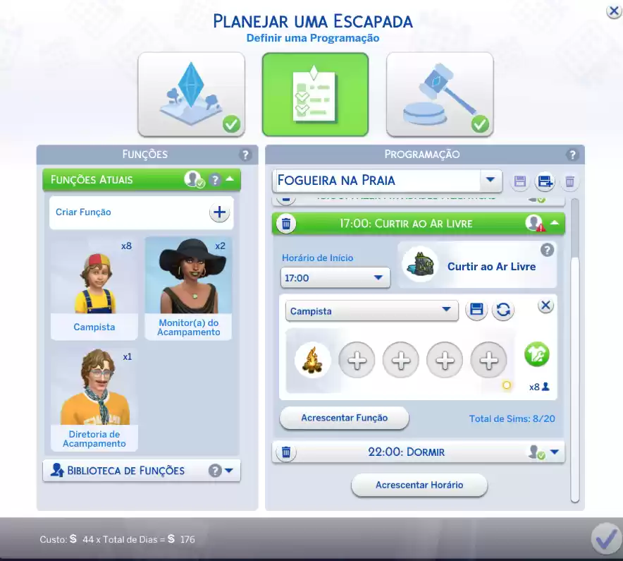 As Funções definem o quem da sua Escapada. Cada função contém 3 partes importantes: os Critérios dos Sims, as Atividadesda Função e os Trajes.