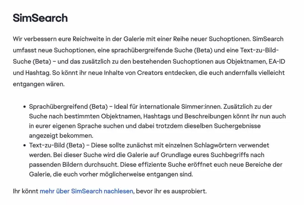 Após uma rápida pesquisa no Google, encontrei as notas oficiais de atualização em alemão do The Sims 4, que explicam em mais detalhes o que é o recurso SimSearch. As notas oficiais da versão Beta mencionam dois primeiros recursos chegando ao SimSearch: busca multilíngue e busca por imagem baseada em texto.