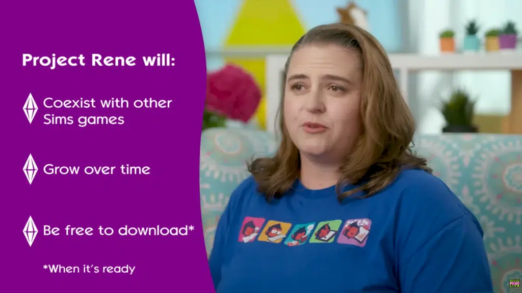 - Na mesma transmissão, foi dito que o Projeto Rene será uma nova forma de jogar The Sims, com foco em multiplayer e em múltiplos dispositivos, enquanto The Sims 4 e Projeto Rene irão coexistir por um bom tempo.