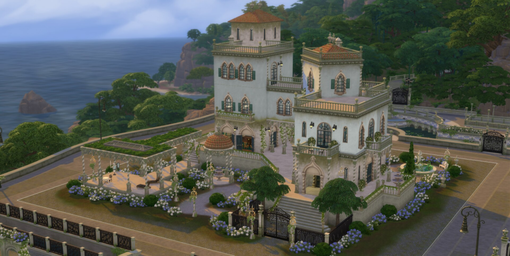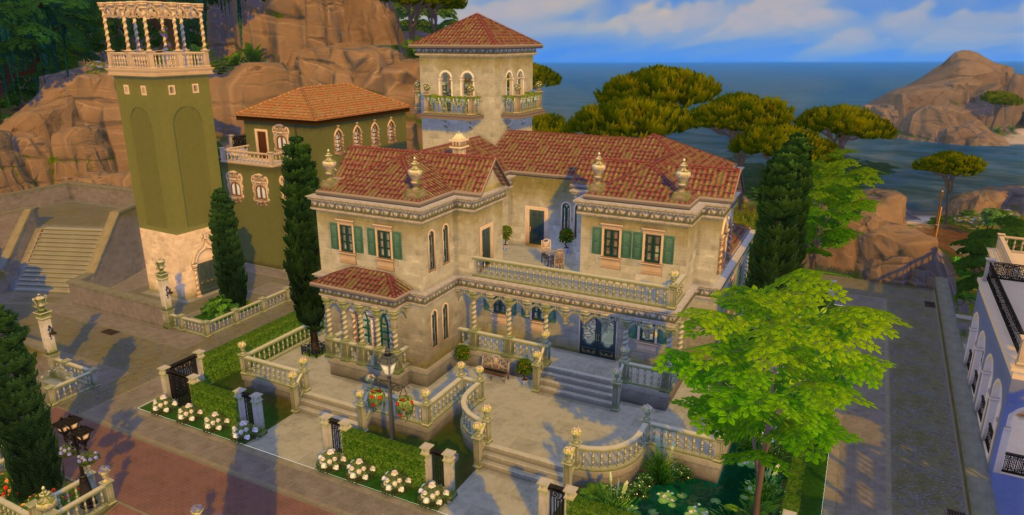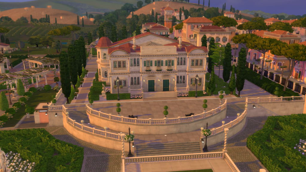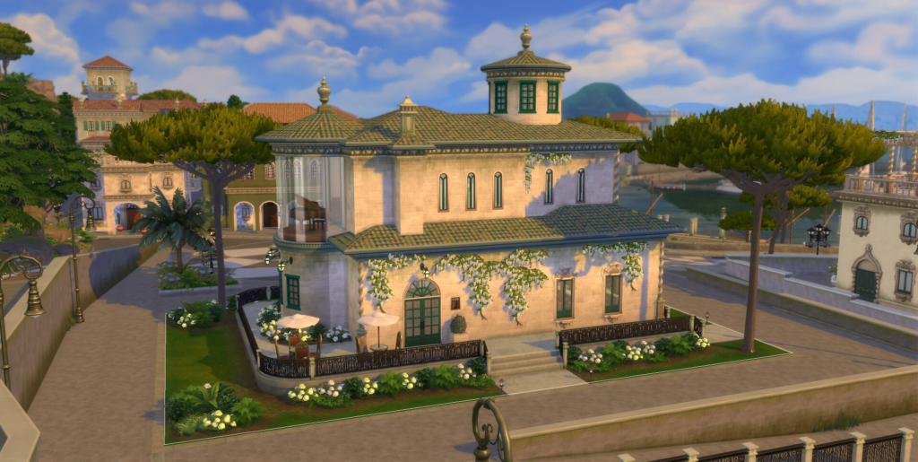 EVA: os dois palácios abrigam famílias muito prestigiadas, que trazem muitas histórias para o universo de The Sims 4! Eu queira garantir que os diferentes traços e personalidades dos Sims fossem refletidos em seus palácios. Por exemplo, a Família/Grupo Caputo é muito materialista, esnobe e gosta de exclusividade, o que aparece nos interiores com acessórios pesados de ouro e uma mobília pomposa e decadente, pois Tebaldo, o chefe da família, gosta de ostentar sua riqueza.