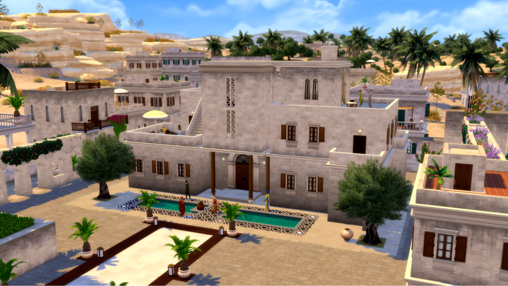 GABBY: Embora Dambele seja conhecida pelo seu senso de comunidade, é um lugar muito luxuoso em elementos culturais e ambientais. Para capturar o luxo e a beleza do ambiente e implementá-los na residência Nobre, eu comecei com os chafarizes na frente da casa como um ponto focal e fui desenvolvendo a estrutura da construção em torno disso! Combinada com calcário neutro, ladrilhos geométricos e colunas, eu queria que a estrutura tivesse um formato moderno e visualmente interessante, com alturas variáveis, meias paredes e portas e janelas no estilo de Dambele. Algo com opulência moderna e influência da África Ocidental! A escada externa do segundo andar também foi uma decisão de design que eu tomei perto do fim, e acho que ela trouxe textura e personalidade à construção.