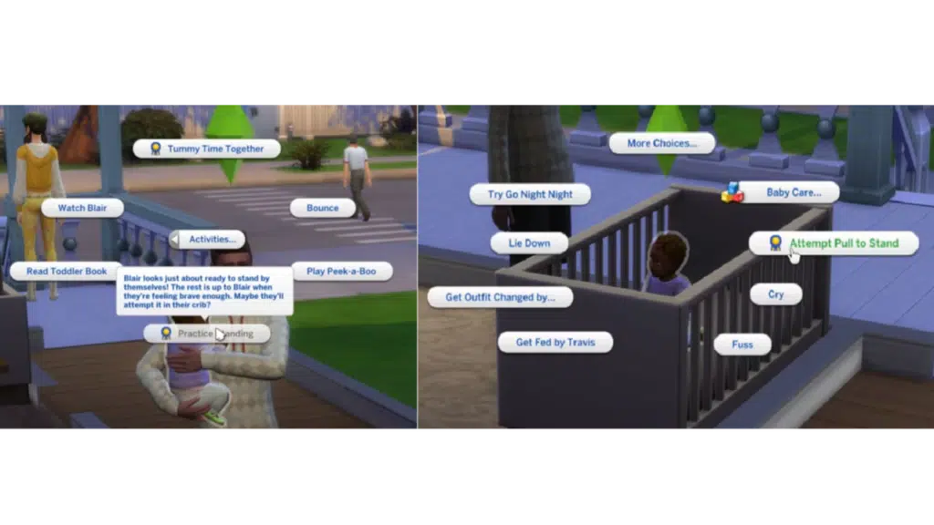 - [EA Forums] Tratamos de um problema em que era difícil desbloquear o Marco Apoiar para Ficar em Pé. O problema é que Bebês de Colo precisavam estar perto de certos objetos específicos para se apoiarem pela primeira vez, mas isto nunca era indicado para quem joga, e às vezes os bebês não estavam perto destes objetos. Eles ainda podem desbloquear este Marco do mesmo jeito que antes, mas, para eliminar a questão de isto não ser óbvio em muitos casos, adicionamos uma interação desabilitada e uma dica de ferramenta para orientar Simmers a colocar o Bebê de Colo no Berço. No berço, o Bebê de Colo pode se apoiar e ficar em pé, e (como opção adicional), adicionamos uma nova interação para Sims Bebês de Colo no berço para se apoiar e ficar de pé quando estiverem prontos para desbloquear o Marco. Esta interação estará disponível no Sim Bebê de Colo quando ele for o Sim Ativo.