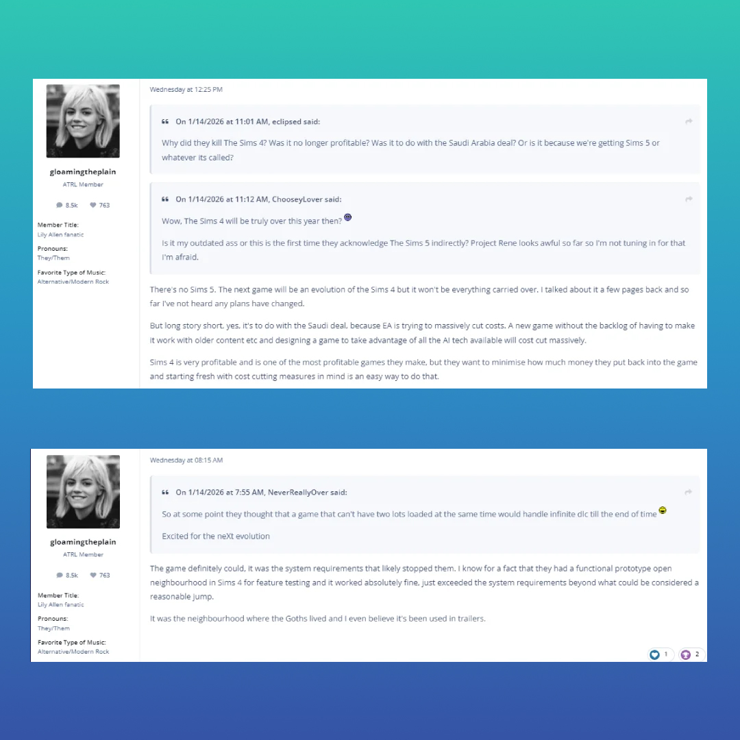 À primeira vista, os rumores dizem que The Sims 4 não vai acabar porque “deu errado”. Pelo contrário: ele ainda dá muito lucro. O problema seria outro: o motor gráfico (engine) e a tecnologia do jogo já são antigos e limitados, então criar recursos novos e grandes pode demorar mais, custar mais e dar mais trabalho do que a EA quer bancar por tanto tempo.