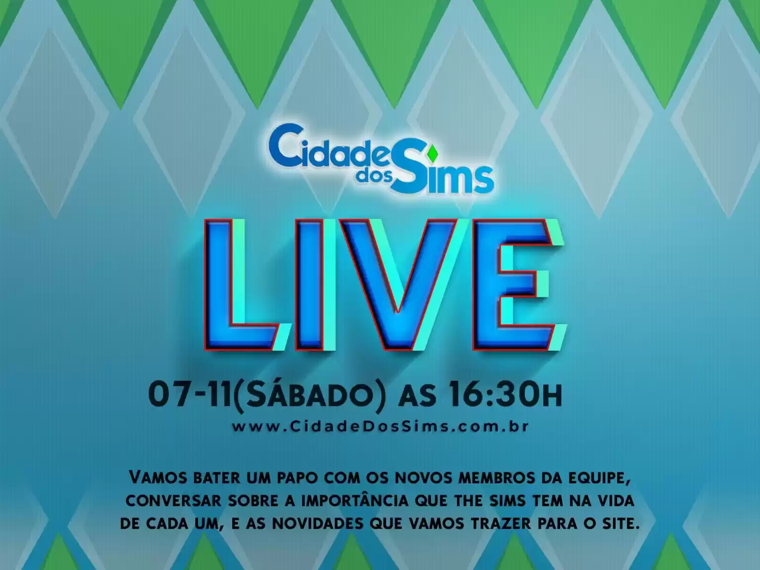 Olá meu povo!Vim aqui para informar que sábado as 16:30 teremos uma live com toda equipe da Cidade dos Sims, vamos receber os novos jornalistas que entraram esses dias na…